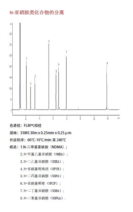 N-亞硝酸銨類化合物的分離(基因毒性和元素雜質(zhì)相關(guān)應用圖譜)菲羅門氣相柱