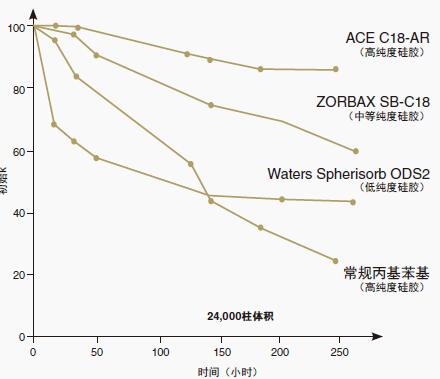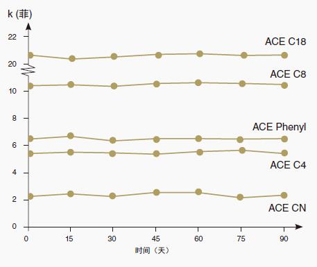 由于使用超高純度的硅膠固定載體粒子以及鍵合相的極高表面覆蓋,ACE鍵合相表現(xiàn)出極高的穩(wěn)定性。(參見圖9)